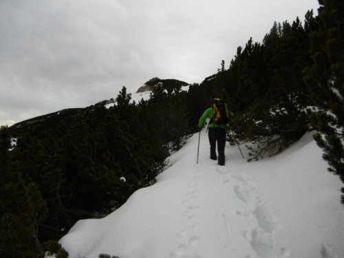 Quando riusciamo ad aggirare la fascia dei pini mughi, finalmente troviamo una neve decente.